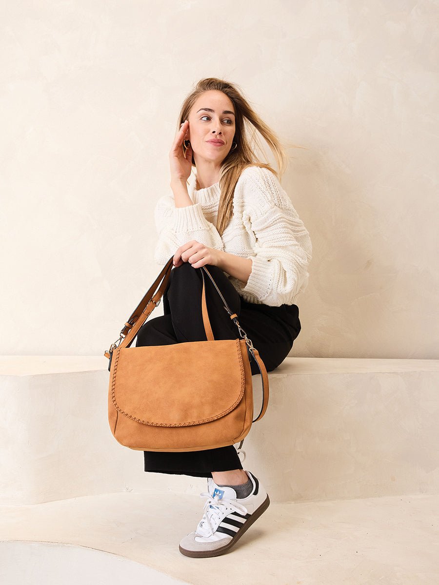 Shop now and add the Jess Faux Suede Satchel with Whipstitch Flapover to your collection for a stylish and functional accessory!