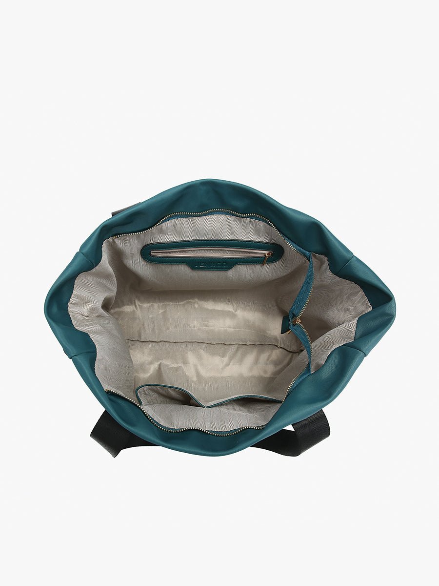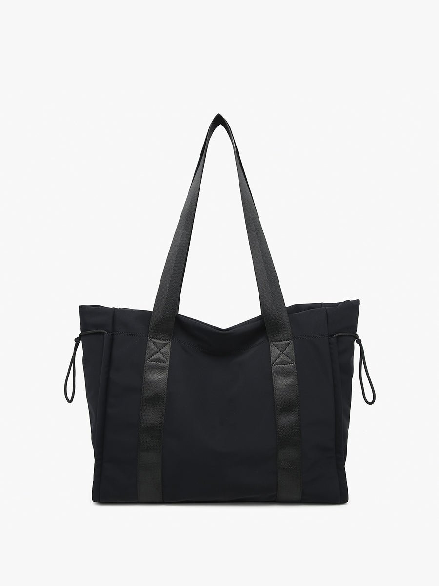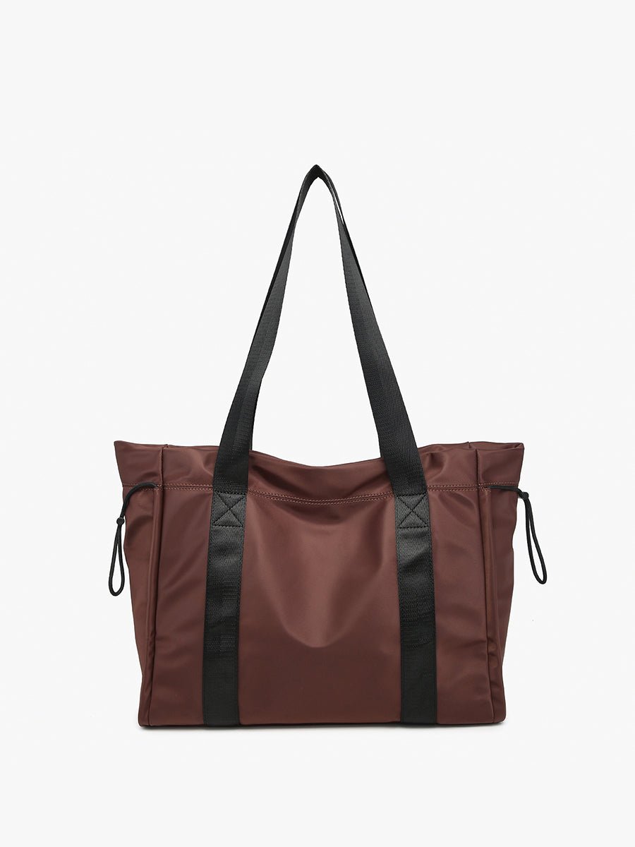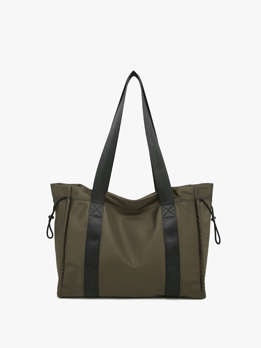 The Lydia Drawstring Nylon Tote with Contrast Handle is a chic and practical accessory. ideal for adding style and functionality to your fall wardrobe.