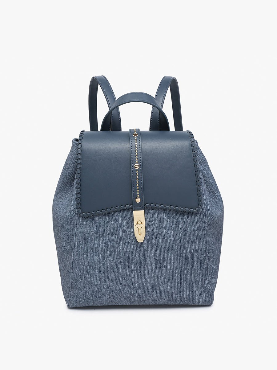 The Olive Denim Studded Whipstitch Backpack combines edgy style with functional design. making it a standout piece for any wardrobe.